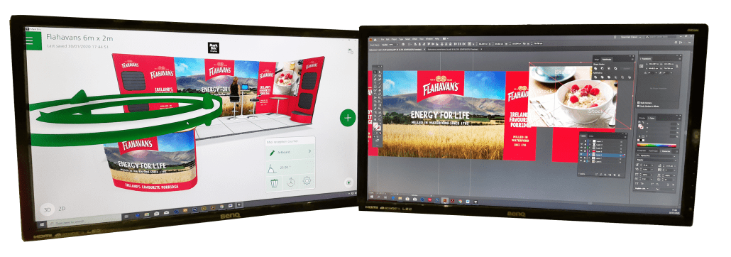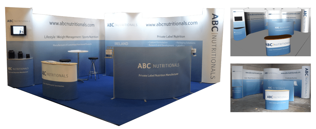 We help you visualise how your display stand will appear to visitors, ensuring you know where to place your most important information. For eg: the first design draft for ABC Nutrition placed “Ireland” below where it could be easily seen, an error it was extremely valuable to correct pre-production.