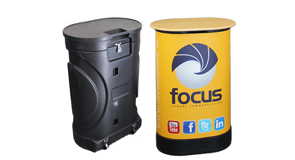 Our Smart Podium Upgrade allows you to easily upgrade your roll-case to a handy podium by adding wooden desktop & wraparound graphic panel.