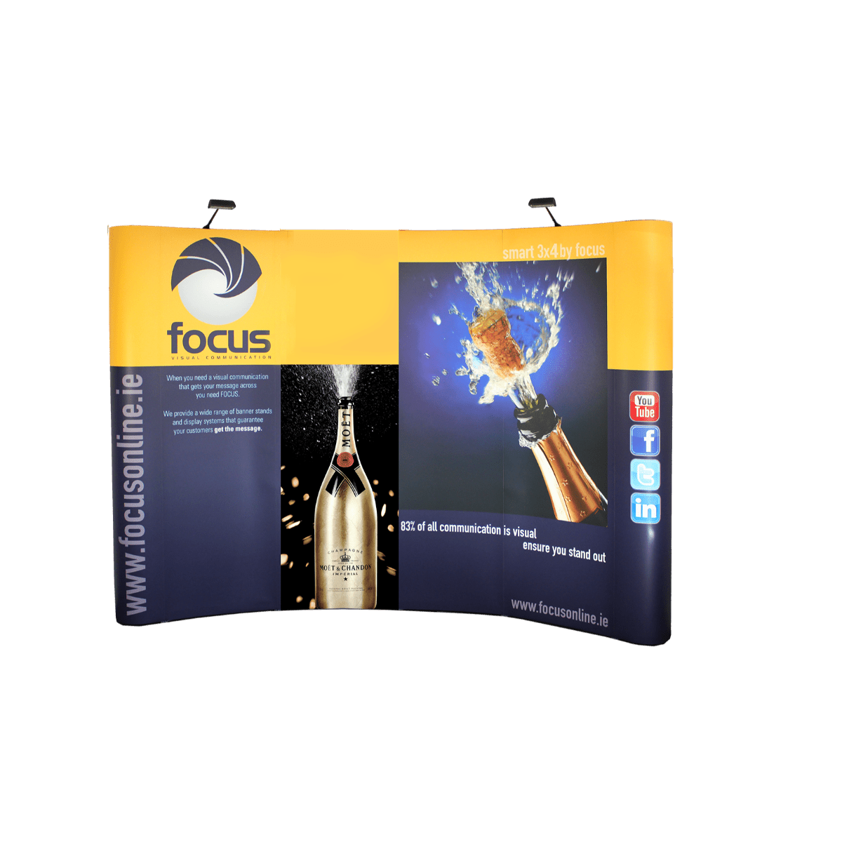 The Focus Smart 3×4 Pop-up Stand is an easy to use curved pop-up display with 6 graphic panels supplied is a wheedled roll-case.