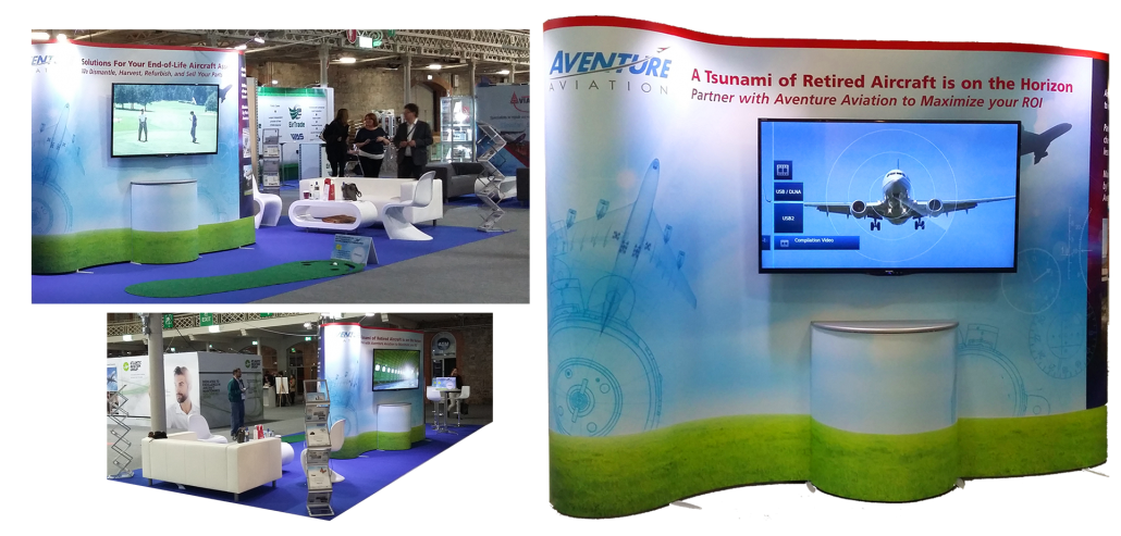 Planning an exhibition in Ireland could be a chore when you are based in Atlanta, USA, but we remove the stress by offering complete event rental options package with your display set up before you arrive. For Aventure Aviation we even sourced a mini-golf tee!! Our management package includes liaising with event organisers to reserve expo space & electrics, hiring furniture and even providing temp sales staff for the days of your event. All you need to do is arrive!