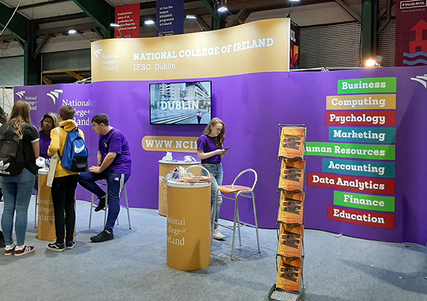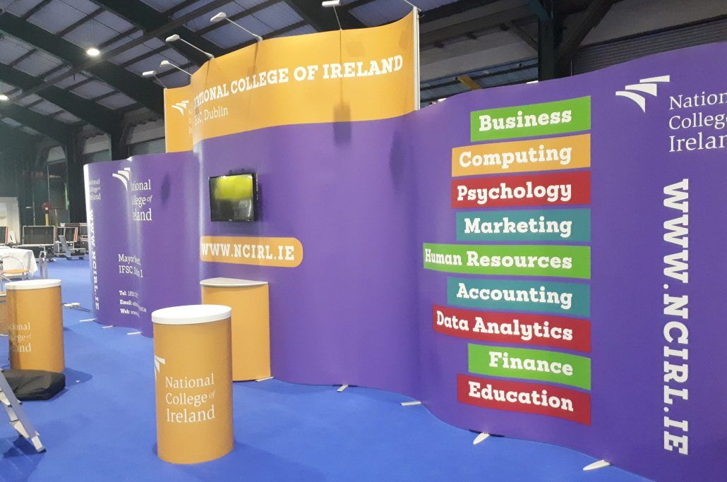 Even clients who have already purchased a sizeable exhibition stand occasionally need a little more! So once a year we simply rent and install the 3.5m central section complete with 50” monitor so that the NCIRL display literally stands out above the rest at Higher Options expo! And because we store your graphic panels, next year’s show is even more cost effective!